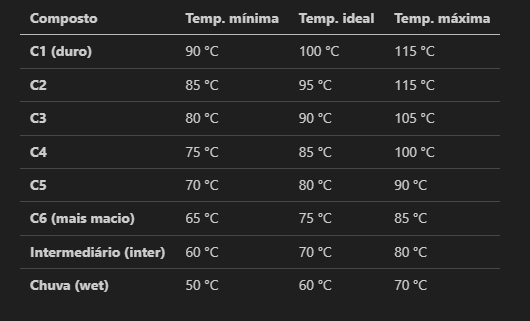 Cada tipo de pneu (macio, médio, duro, intermediário, etc) tem uma temperatura ideal diferente pelo fato da sua composição ser diferente, quanto mais “macio” é o pneu, menor é a temperatura ideal dele, visto que altas temperaturas tendem a desgastar perigosamente esse tipo de pneu. Abaixo tem uma tabela com a temperatura ideal para cada pneu.